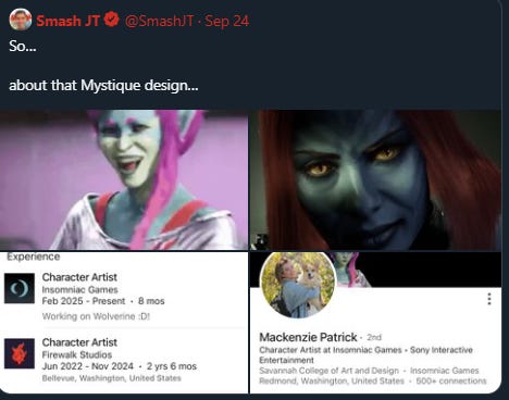 Nevermind that Mystique is a shapeshifting mutant and will be able to look completely differently throughout the game. Nevermind that even by the bizarre standards they’re applying she’s not traditionally ugly. Nevermind that new interpretations of characters is a good thing actually and that the comics feature an endless amount of character variants. Nevermind that she’s once again: a fucking shapeshifter.